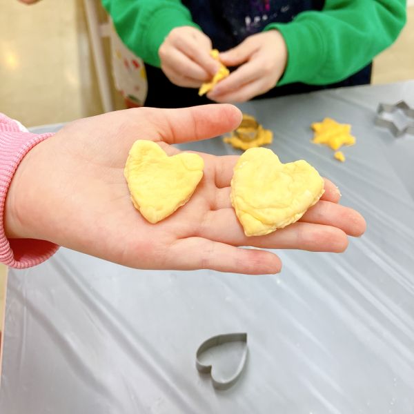 前回のクッキー作りがとても楽しかったというこちらの子は、「持ってきたよ」と、おもしろいクッキー型を見せてくれました。え、花札のクッキー型?!粘土で花札クッキーを量産。