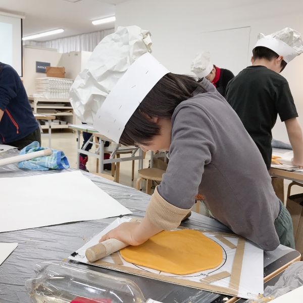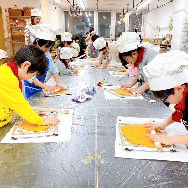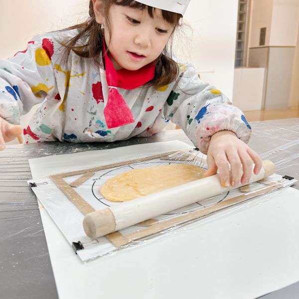 作業台の上に生地をのせて、めん棒でよく伸ばします。これはみんな粘土でよくしているので、すごく上手!なのですが、一定の大きさ以上に広げようとすると「生地がちぢんじゃうよ!?」実は今回、作品が割れにくいように強力粉を使いました。薄力粉よりもグルテンが多く、生地に弾力があるのです。ここも「えい!」体重をかけて作業していました。