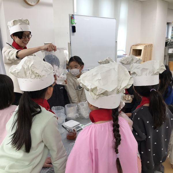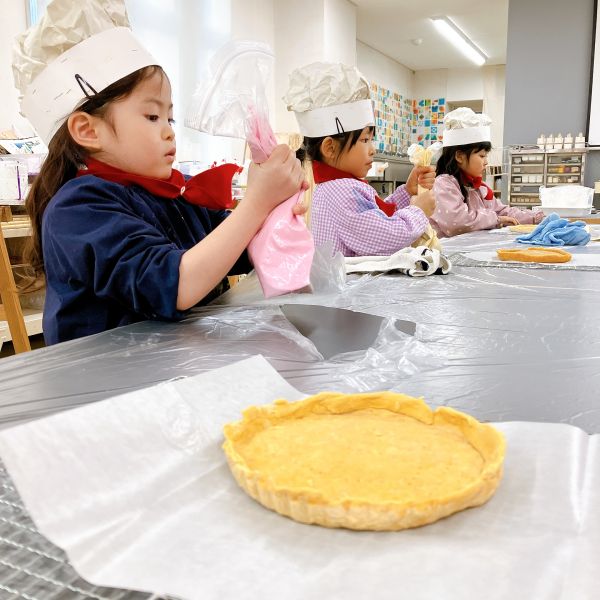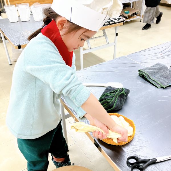 袋の角を切り落として、タルトの中にむぎゅ〜っと絞り出し。袋から出てきたクリームは、ものすごくリアル!自分の想像した通りのクリームができて、何だかいい香りまで漂いそう。「ひゃー、おいしそう!」「これ楽しい!」「しっかりしぼり切るぞ!」どの子も真剣そのもの。