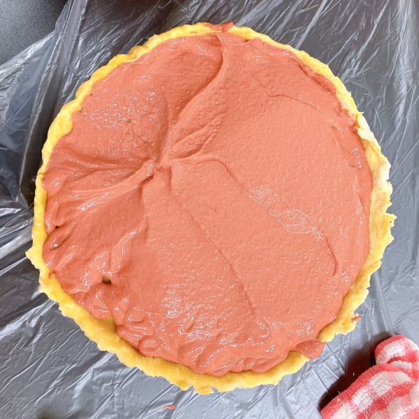 うわあ〜、すごいボリュームのタルトが完成!タルト型からはみ出すほどの勢いです。フルーツをふんだんにのせて「21個も作ったよ!」と、うれしそう。さらにピンクのソースもたっぷりかけて、満足度いっぱいのぜいたくタルト。