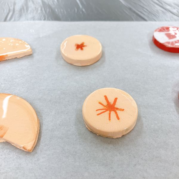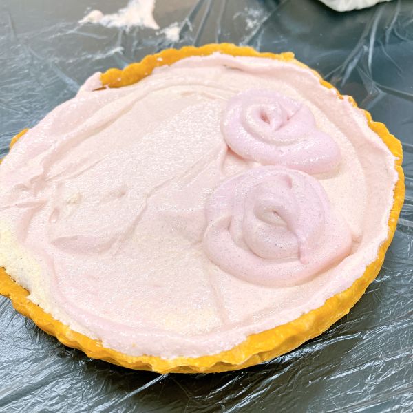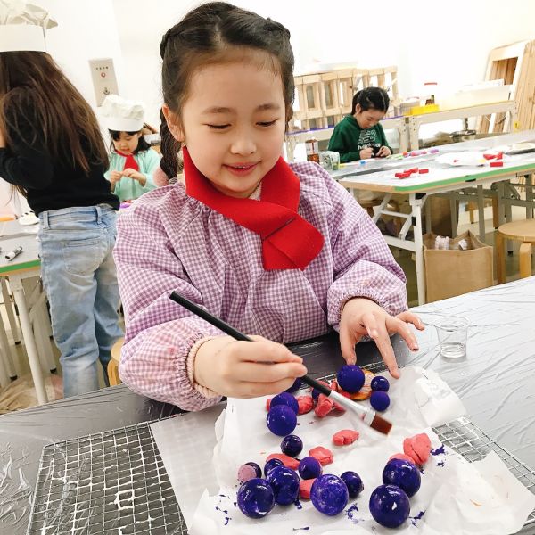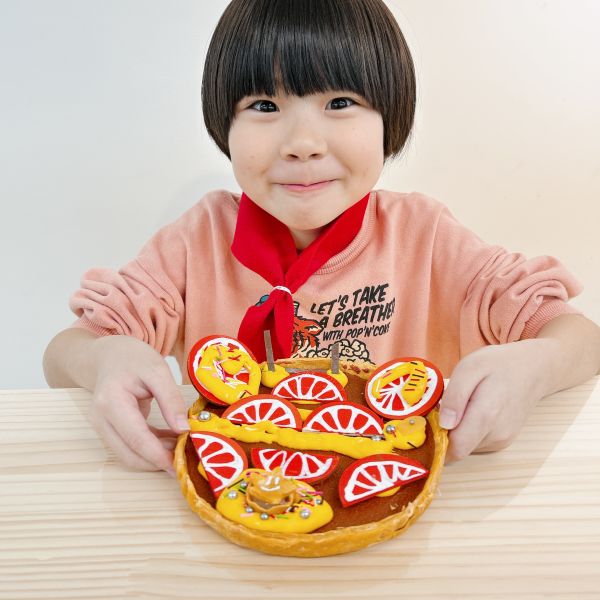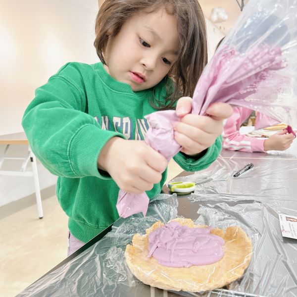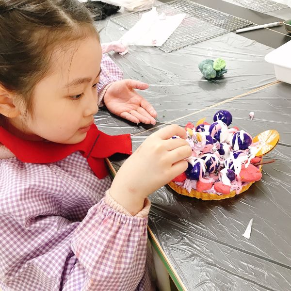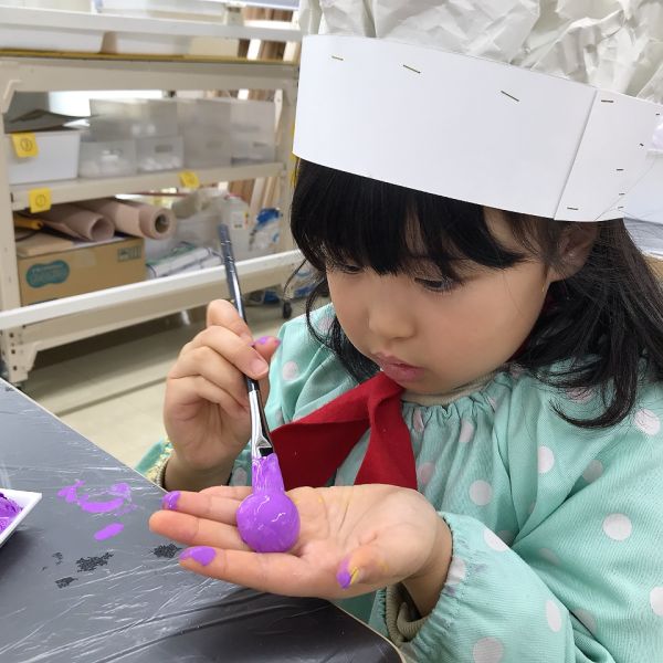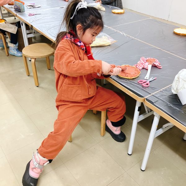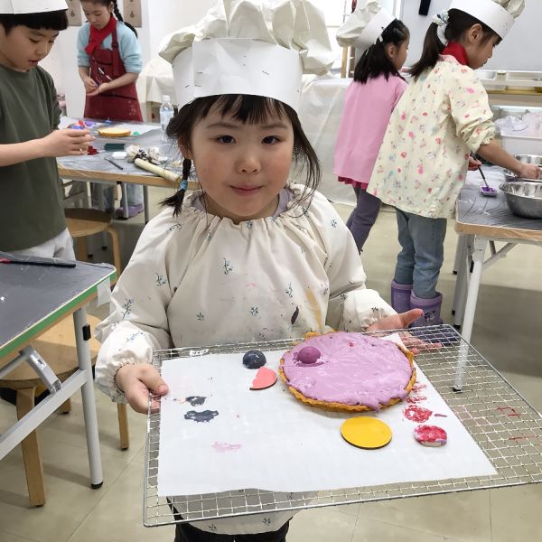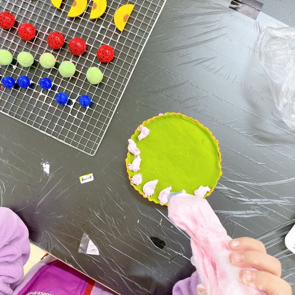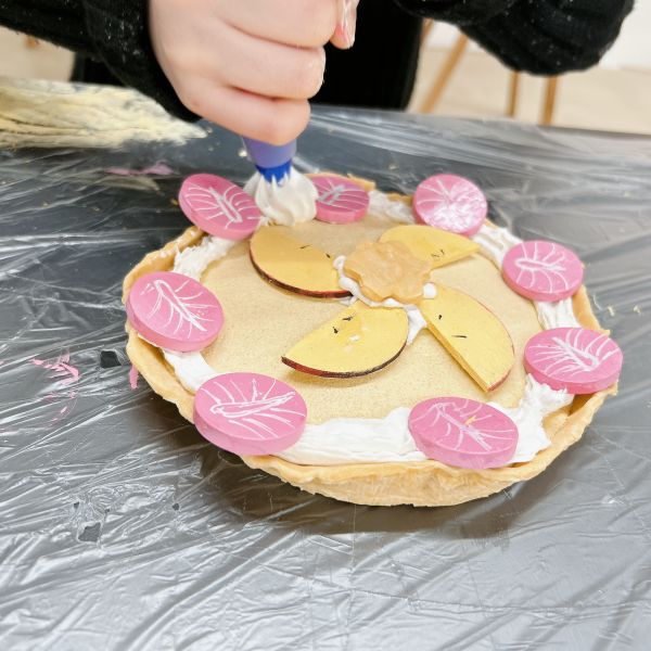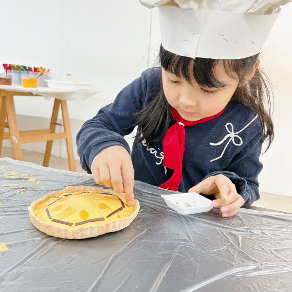 「タルトの土台は、焼いたらきっとこんがりしてるよね?」「それも作りたい!」と、絵の具とスポンジを使って、タルトにこんがり焼き色をプラスしているこちらの子。リアルなイメージがどんどん膨らんでいる様子。もう、本当に、おいしそう…