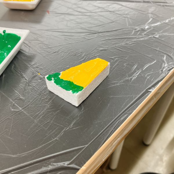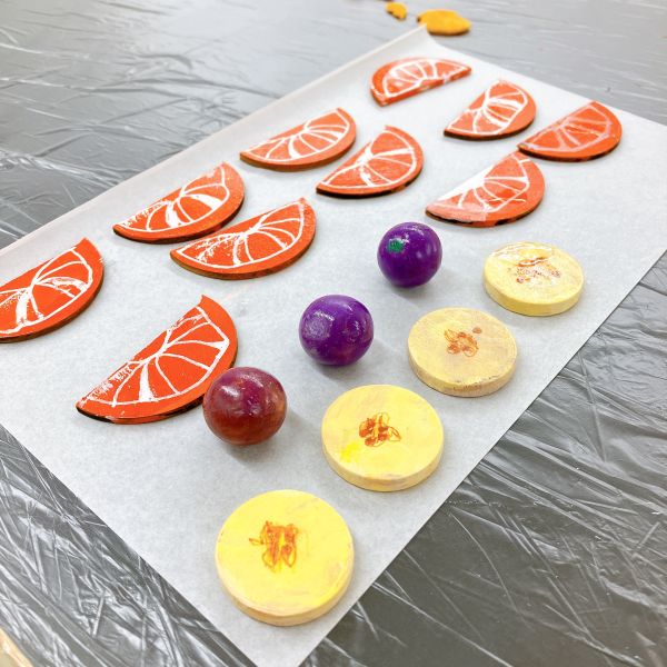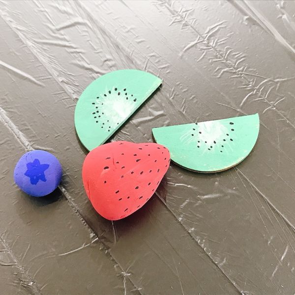 果物の色ができたところで、木や発泡素材のいろんな形のブロックが登場しました。「色を塗ったらキウイになりそう!」「これはイチゴになりそう!」制作の勢いが止まりません。「早く塗りたい!」「10個くらい作らないと!」