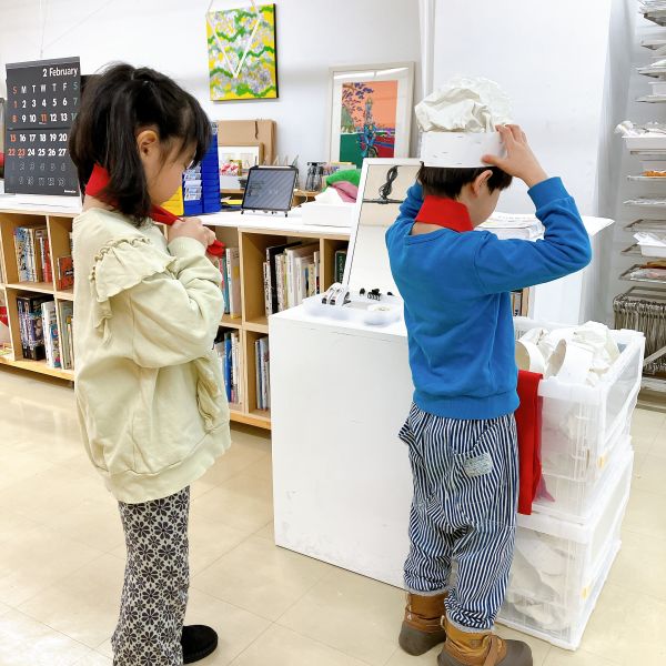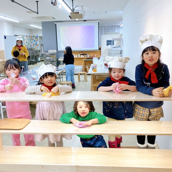 トルネードの教室に、小さなコック帽やスカーフがたくさん。「パンをつくるの?」「コックさん?」「お菓子を作るんだ!」あれこれ想像が膨らんで、さっそくワクワク、そわそわするこどもたち。キッズコースは、おしごと好きな子が多いです。