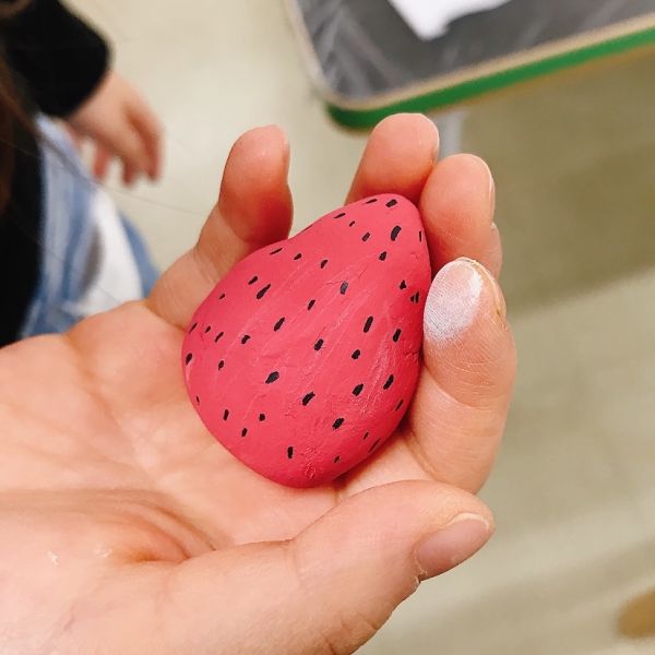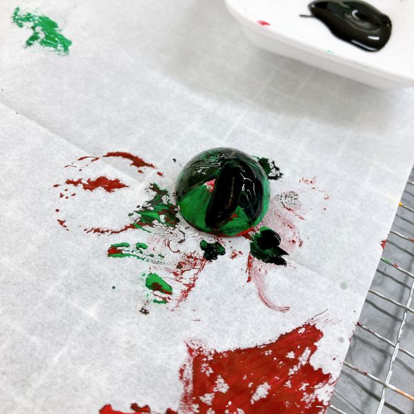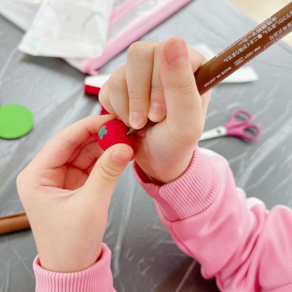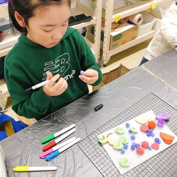 「シャインマスカットをたくさん作りたい!」と粘土を丸めていたこちらの子は、緑を塗っているうちに「ヨッシーの卵」風なものが誕生。「実際食べてみたい!」とワクワクしていました。