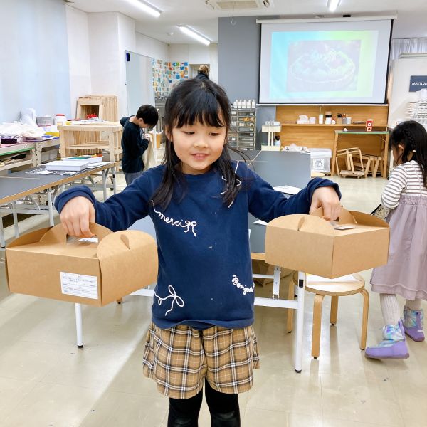 「はい、気をつけてお持ち帰りください」ひとつひとつケーキ箱に入れる手つきも、まるでほんとのケーキ屋さんのようにとてもていねいでした。今度ケーキ屋さんに行ったら、パティシエさんたちのすごい仕事を、いつも以上によく味わってみよう!