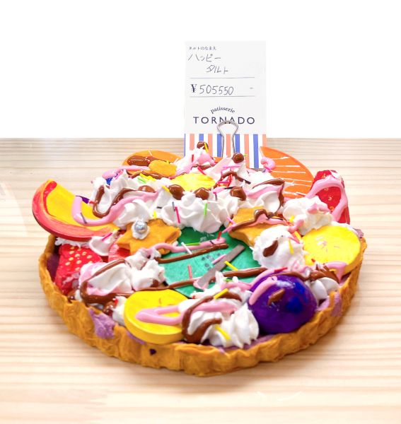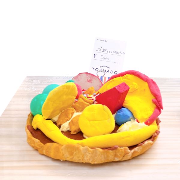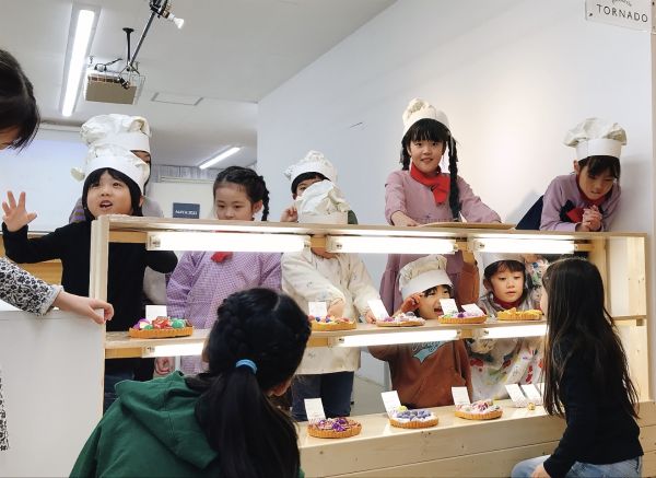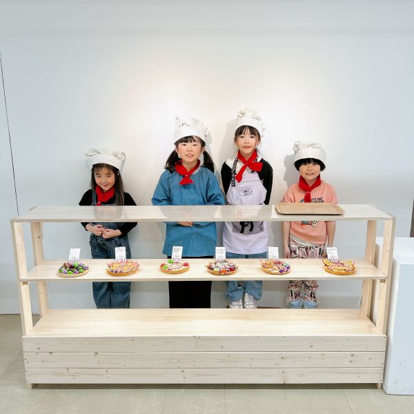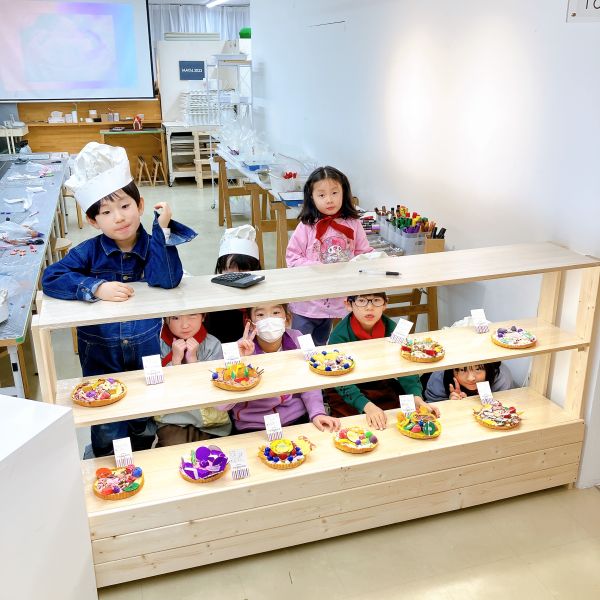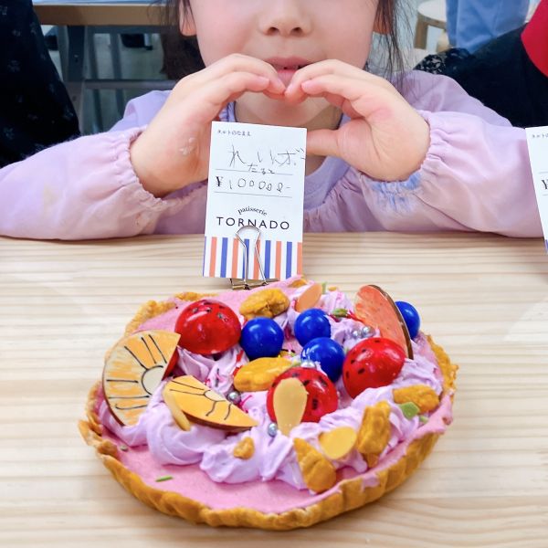 自分の作品に商品タグをつけて、ひとつひとつ棚にきれいに並べていきました。これはもうすっかり、リアルなお店屋さんの雰囲気!さっそく「いらっしゃいませ」「これをください」小さなこどもたちが一生懸命作った、タルト専門店がオープン!