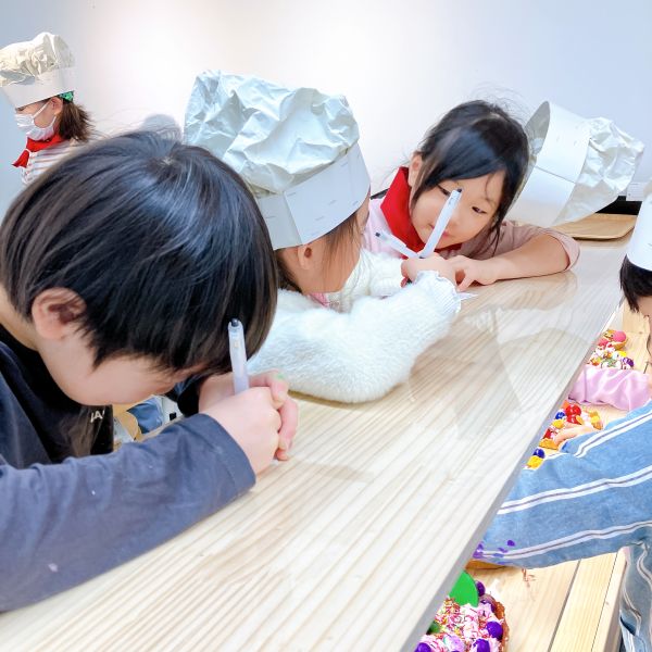 完成したタルトをお店に並べる前に、商品名やお値段を考えました。「はっぱタルト」「オレンジ王タルト」「おいしくてかわいいタルト」本当にこんなお店があったら楽しいなと思うネーミングがずらり。「誰か買ってくれるかなあ」「待って待って!買ってくれたらうれしいけど...買ってほしくないくらい!」開店準備中もにぎやかでした。