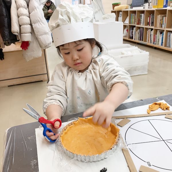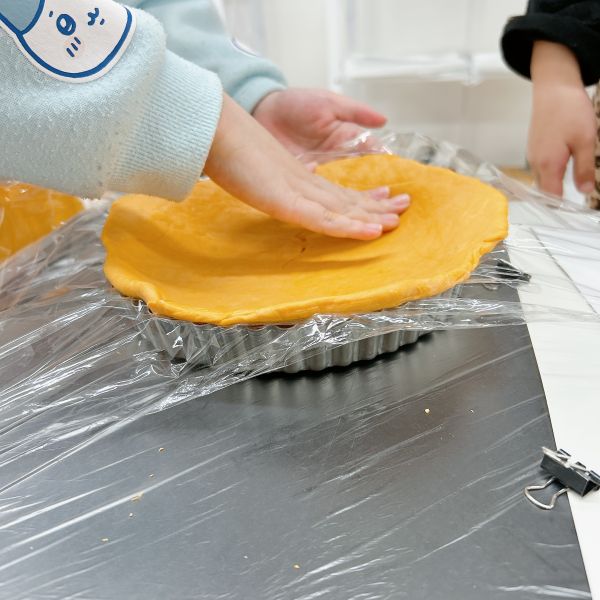 小麦粉に水を混ぜて作る「小麦粉ねんど」を作ったことがある子もいるかな?今回はタルト用に少し材料や配分を工夫して、タルト型に敷いていきます。「え!本物の小麦粉!?」食べられないとはいえ、まるでお料理のレシピのよう。