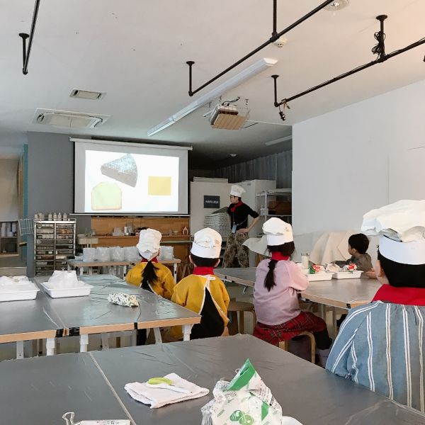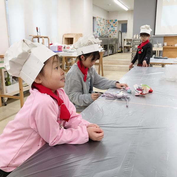 前回作ったタルトの土台。乾燥させてしっかり固まり、本当にお皿のようになっていました。少しヒビが入っていてもなんだかリアルな質感に、みんな嬉しそう。「今日は中身づくりね!」テーブルにどうぐを出し、パティシエの帽子をかぶったら、おしごと開始。