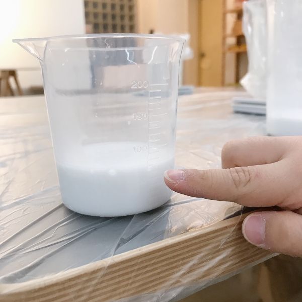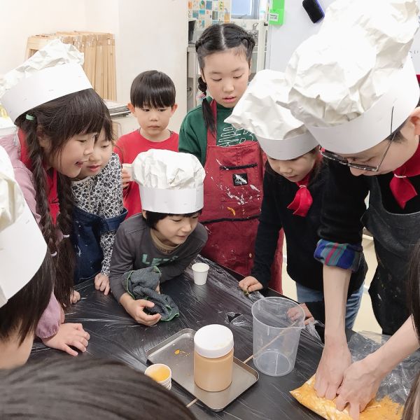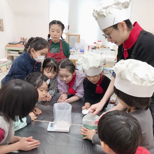 前回も使用したキッチンスケールで、ボンド(たまごの代わり)、砂(アーモンドパウダーの代わり)、絵の具(フレーバーの代わり)という3つの素材を計りました。特に小学生たちは、スケールの使い方をしっかりマスターして、実に手際よく次々と進めていました。