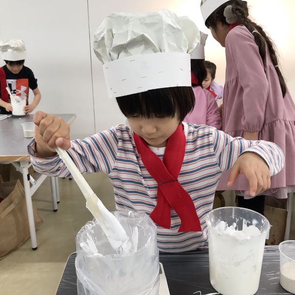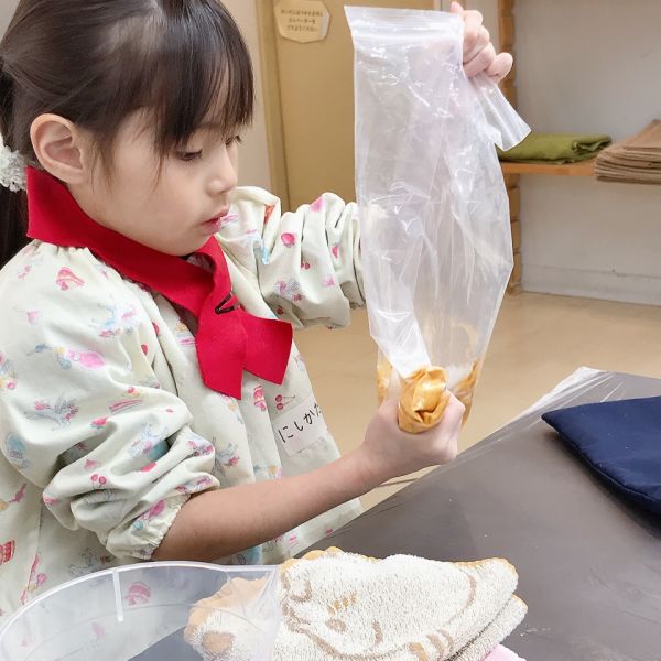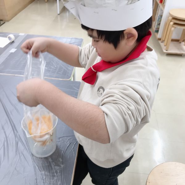 表面の飾りに使うためのクリームも、自分たちの手で作りました。混ぜたのは紙粘土と水、そして木工用ボンド。キッチンスケールの登場に「計りはもうまかせて!」というくらい、みんなすっかり使い慣れた様子で自信満々です。絵の具をチョイ足しして、好みのフレーバークリームにする子も。袋の口を結んだら…