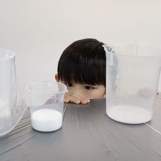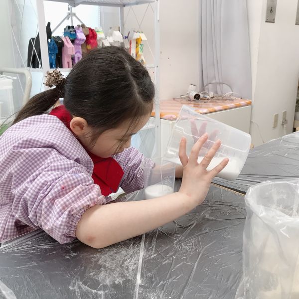 タルト生地にはたまごが使われます。が、今回は絵の具とボンドを混ぜた水で代用。色はもちろん、トロッとした質感も本物のたまごそっくり!ぴったりの量を、先に計った小麦粉や塩の袋に入れていきます。液体を注ぐ作業に、ちょっとドキドキな様子…