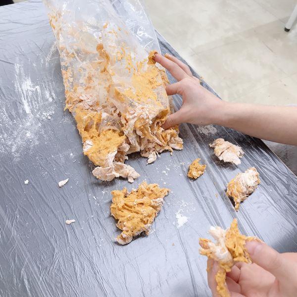 キッズのまだ体が小さなこどもたちは、全身の体重をかけるように一生懸命!想像以上に大変だったようで、ニコニコしながらも「もうだめだ」「手がつかれてきたよ!」なんて声も。ひじやひざなどを使ってぐりぐり!自分なりの練り方法を編み出していました。