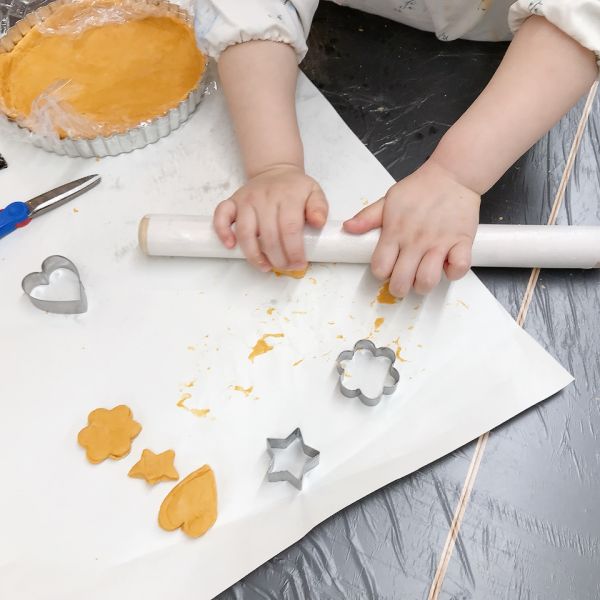 切り落とした部分の生地も、丸めて再利用。好みの厚みに伸ばして、いろんな形の型で抜いたらクッキーに!これはタルトのデコレーションにも使えそう。これもまた楽しく、みんなどんどん作っていました。