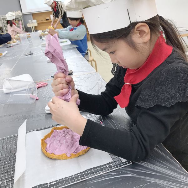 「スライスしたオレンジをここに並べて…」「2色のブドウをしましまに配置して…」ニコニコしながら、みんなすごい集中力で最後の作り込み。それぞれの「こうしたい!」がはっきりと感じられる取り組みでした。デコレーション兼接着剤にもなるクリームの塗り方や絞り方にも、工夫が感じられます。