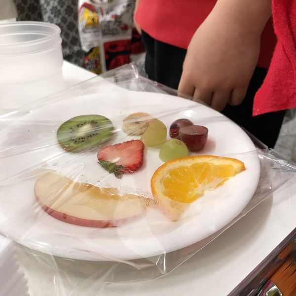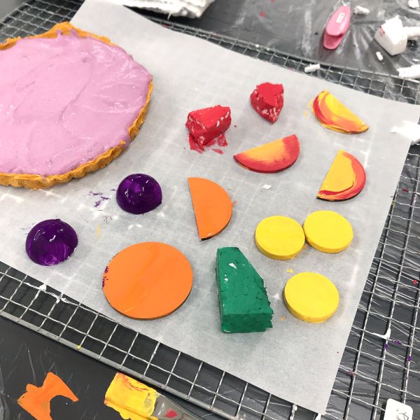 クリームを入れ終わったら、次のお楽しみ。トッピングフルーツ作りでは、サンプルとして本物のカットフルーツも登場!「わ〜」「食べたい」「いいにおい!」おいしそうなフルーツを目指して、絵の具の色づくりからスタートです。