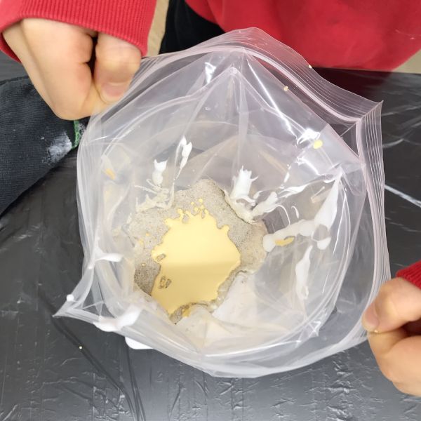 粉や液体を入れたら、袋の口をしっかり閉じて「よし、できた!」準備万端です。「あ!あれをするんでしょ!」いつもママのお料理を見ているこどもたちは、次の動作の想像がつくようです。「こねる!」「もみたい!」