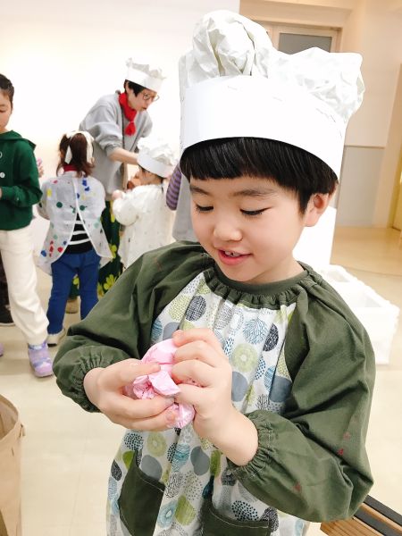 お楽しみの「もみもみ!」このタルト作りのプログラムでは、毎回何かを混ぜて材料を作りました。それぞれちがう感触なのが新鮮なようで、こどもたちも「次はどんな感触かな」とワクワクな様子。「机にぎゅっと押すといい」「振ると混ざるよ!」自発的にいろんな混ぜ方を発見していました。