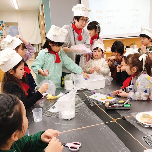 今月は、みんなで「食べられないケーキ」を作ります。「ええ〜?!」「それってどんなの?」食べられないのはちょっと残念そうですが、やっぱりみんな興味が勝る様子。みんなが知ってるケーキを聞いてみると「はい!チョコケーキ!」「ショートケーキ」「シフォンケーキ!」「チーズケーキ!」